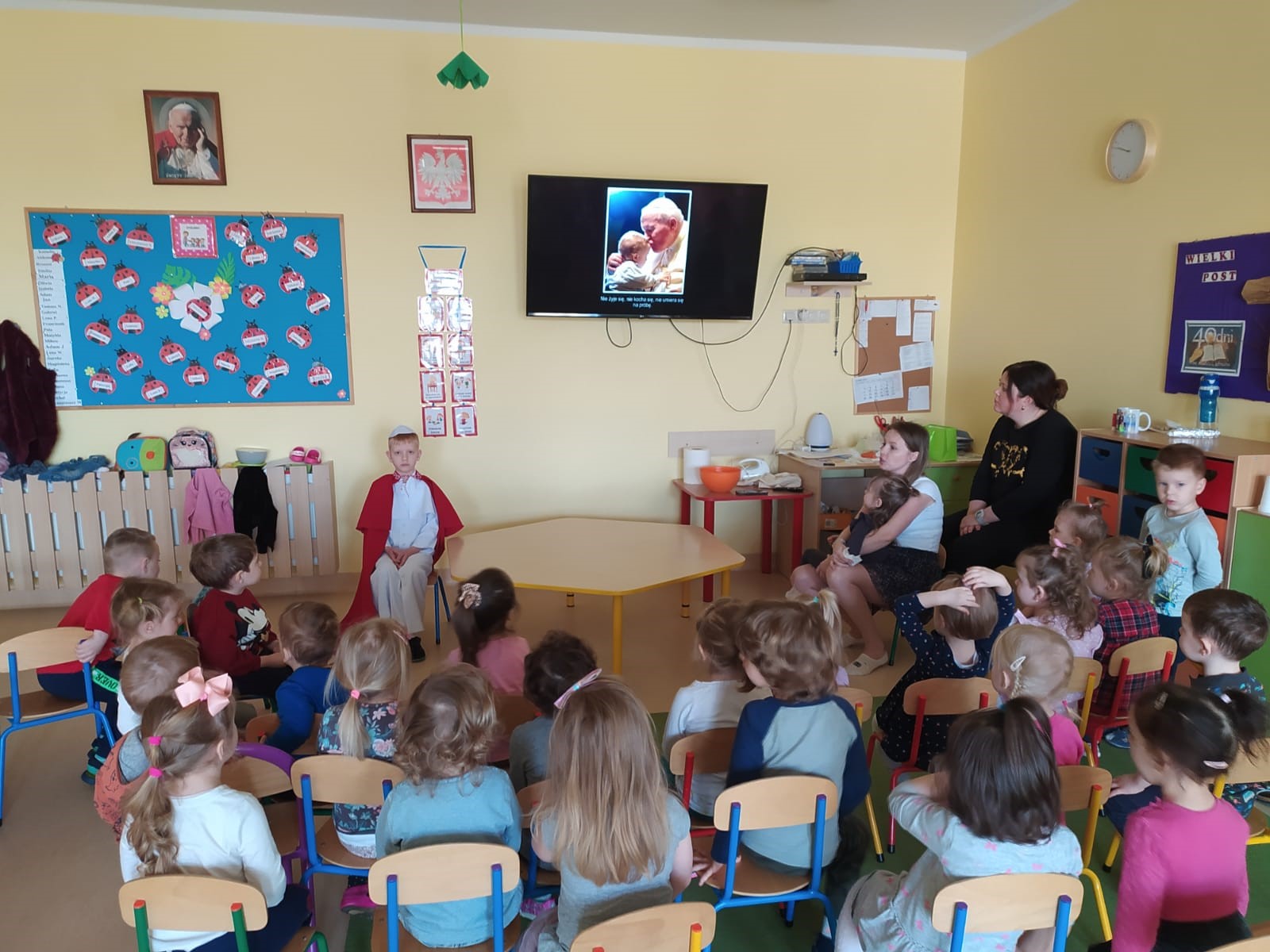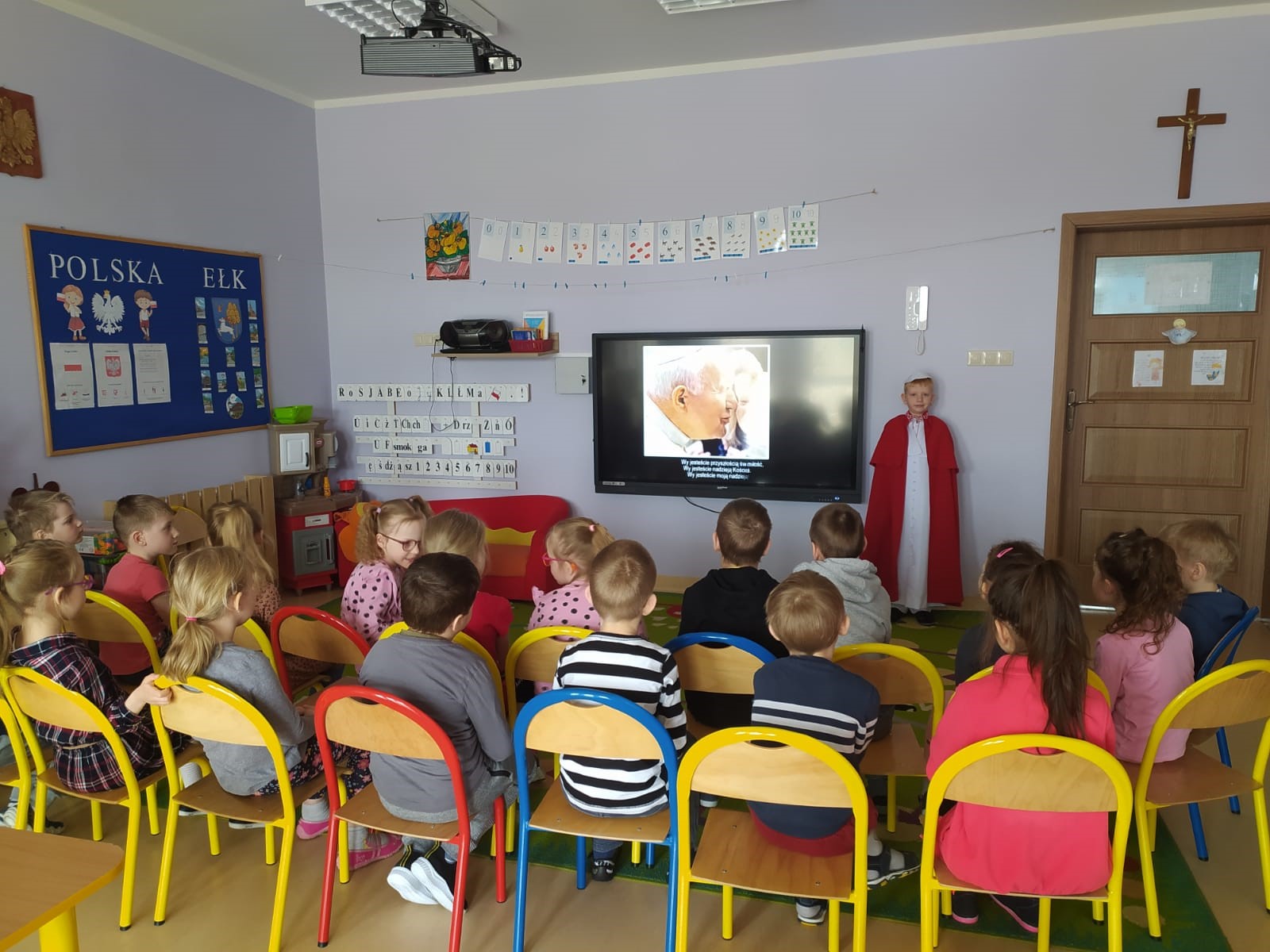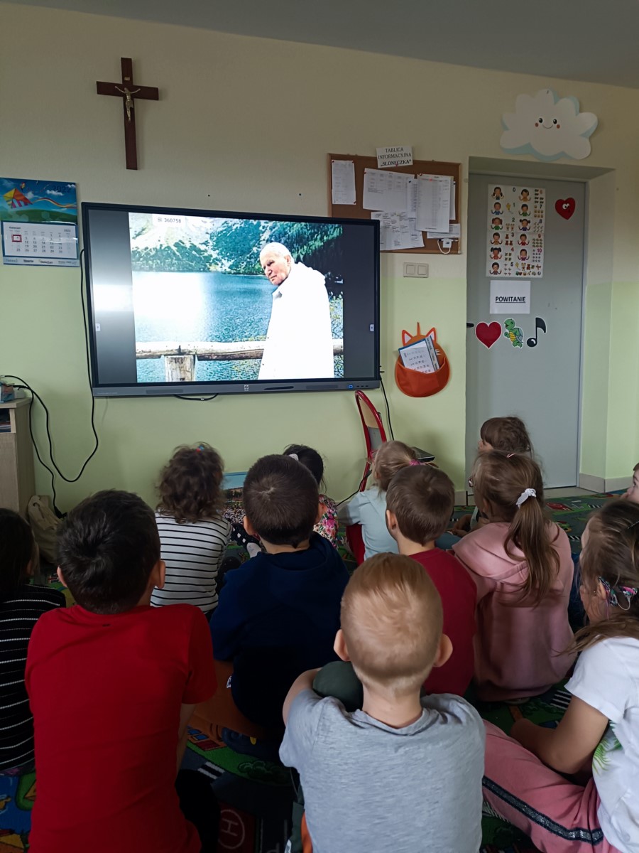 Z okazji rocznicy śmierci Papieża Polaka dzieci mogły przypomnieć sobie fakty z życia tego Świętego, oglądając prezentację multimedialną przygotowaną przez wychowawczynie z najstarszych grup oraz słuchając wzruszających wierszy i opowiadań. Dzieci obejrzały również projekcje filmów animowanych o życiu św. Jana Pawła II. Ponadto w każdej grupie dzieci wykonały ciekawe prace plastyczne związane z postacią patrona przedszkola. Bardzo duże zainteresowanie wśród wychowanków wzbudził niespodziewany gość, czyli Jakub z grupy „O” przebrany za papieża. Wszyscy chętnie pozowali do pamiątkowych zdjęć z tym niezwykłym gościem. Całości dopełniały wzruszające piosenki wykonywane zarówno przez młodsze, jak i starsze grupy.