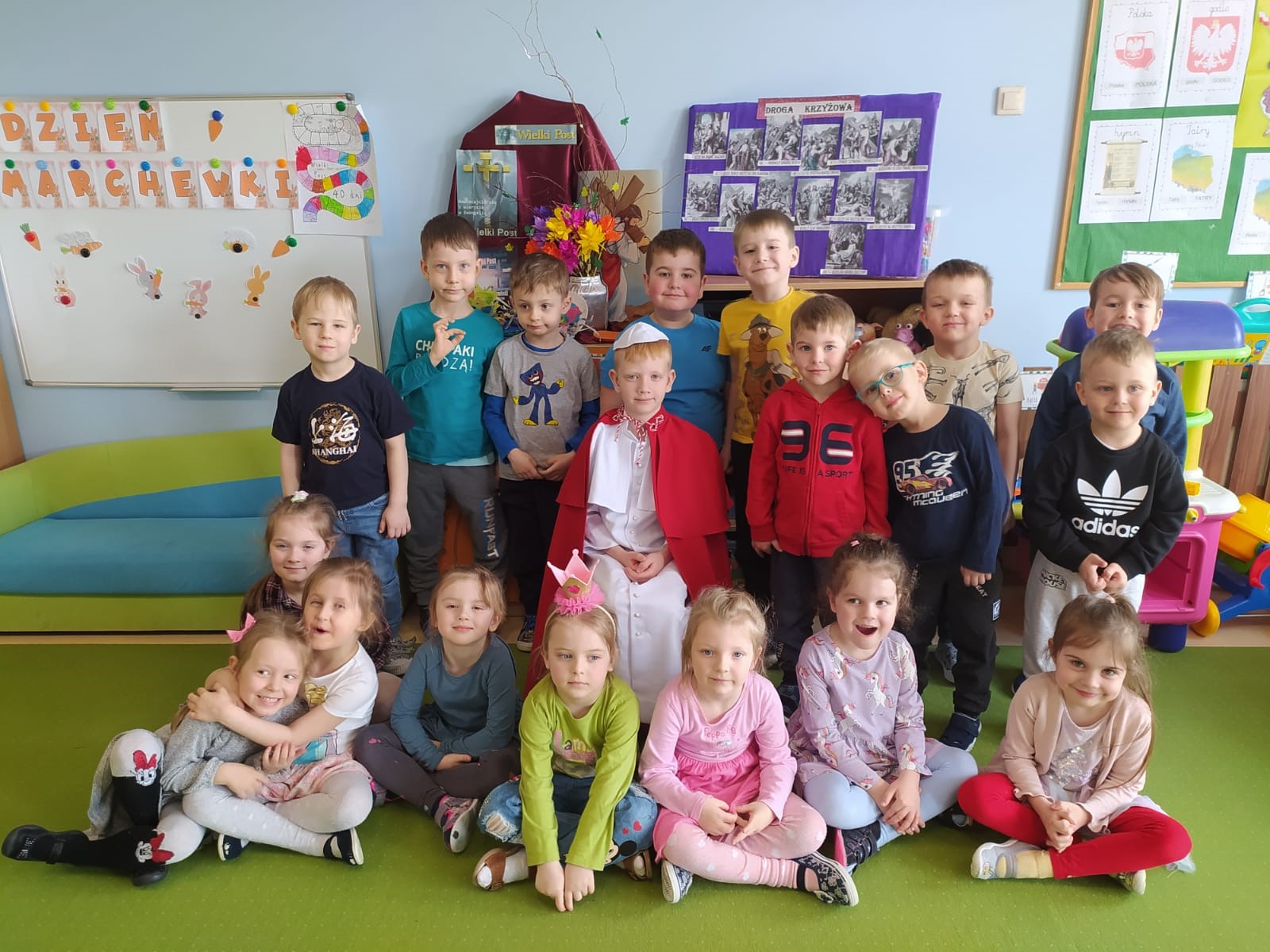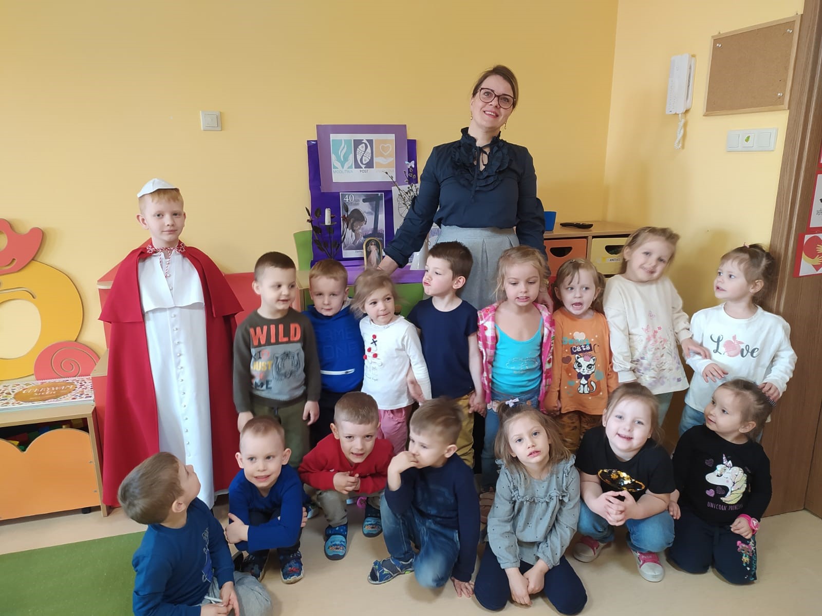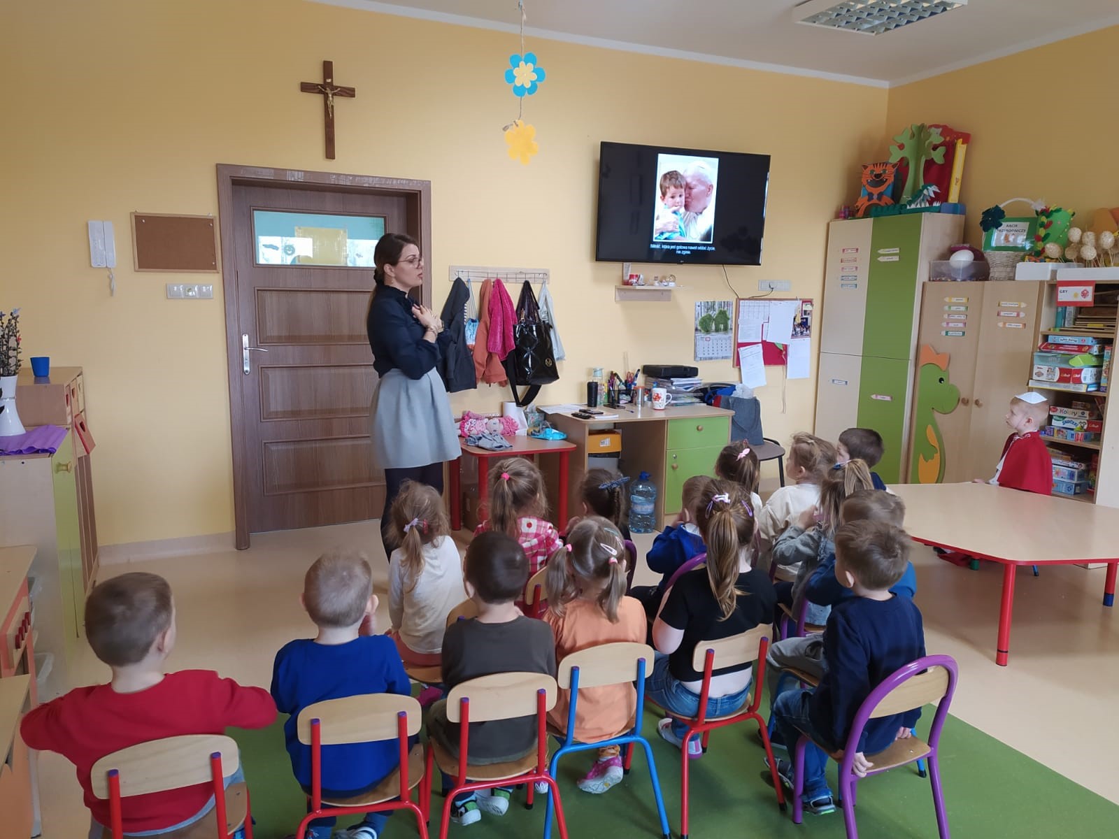 Z okazji rocznicy śmierci Papieża Polaka dzieci mogły przypomnieć sobie fakty z życia tego Świętego, oglądając prezentację multimedialną przygotowaną przez wychowawczynie z najstarszych grup oraz słuchając wzruszających wierszy i opowiadań. Dzieci obejrzały również projekcje filmów animowanych o życiu św. Jana Pawła II. Ponadto w każdej grupie dzieci wykonały ciekawe prace plastyczne związane z postacią patrona przedszkola. Bardzo duże zainteresowanie wśród wychowanków wzbudził niespodziewany gość, czyli Jakub z grupy „O” przebrany za papieża. Wszyscy chętnie pozowali do pamiątkowych zdjęć z tym niezwykłym gościem. Całości dopełniały wzruszające piosenki wykonywane zarówno przez młodsze, jak i starsze grupy.