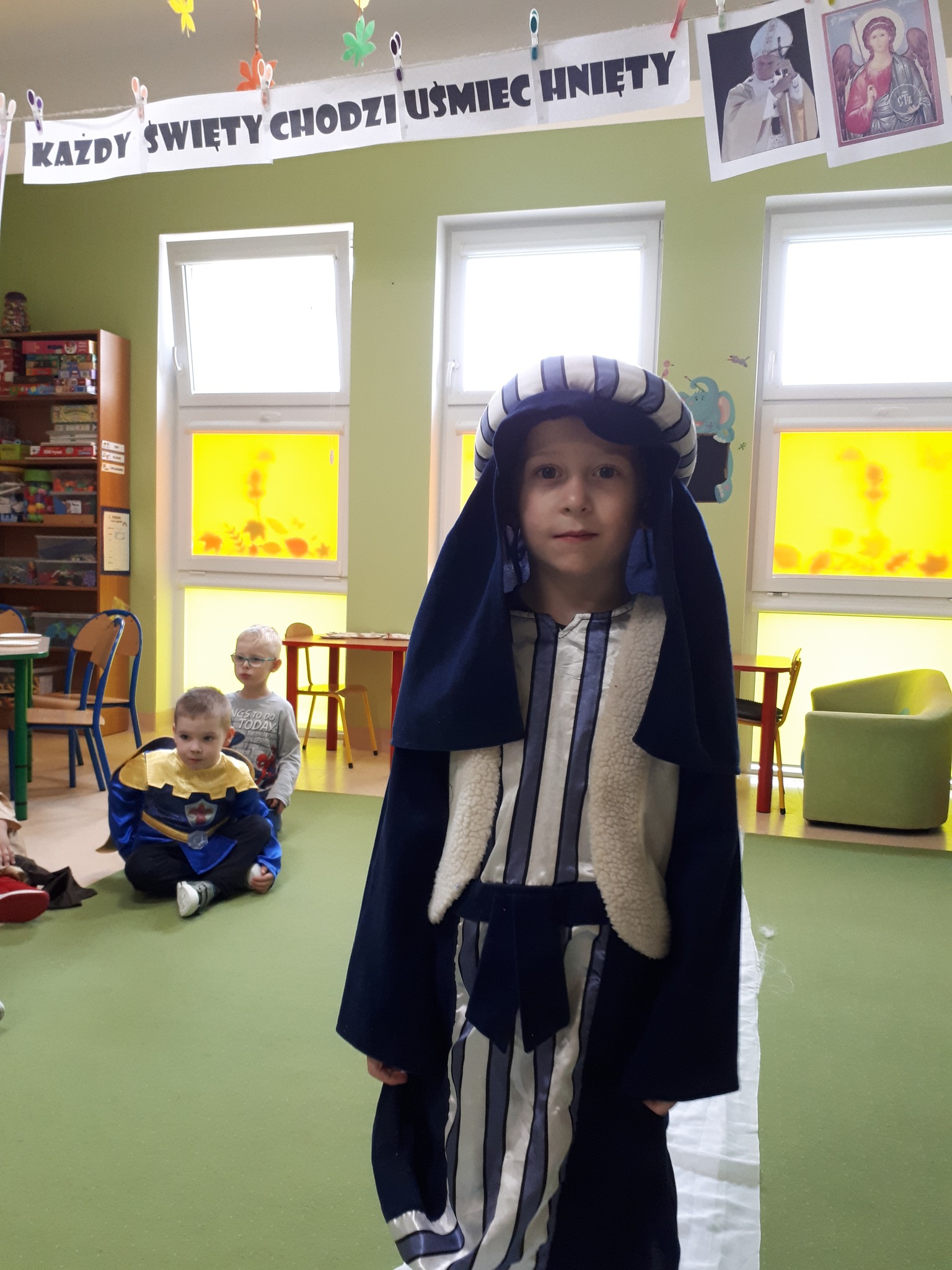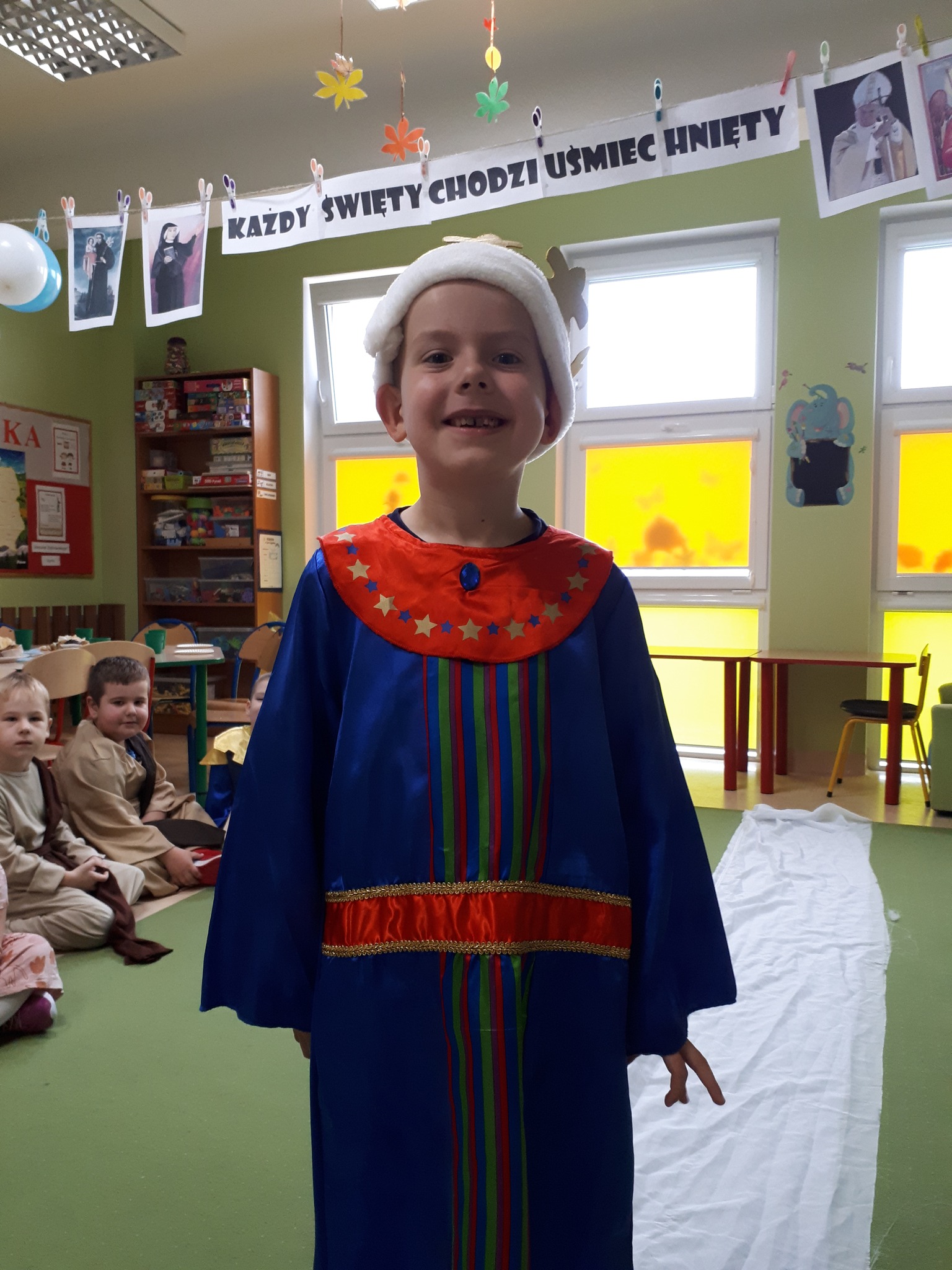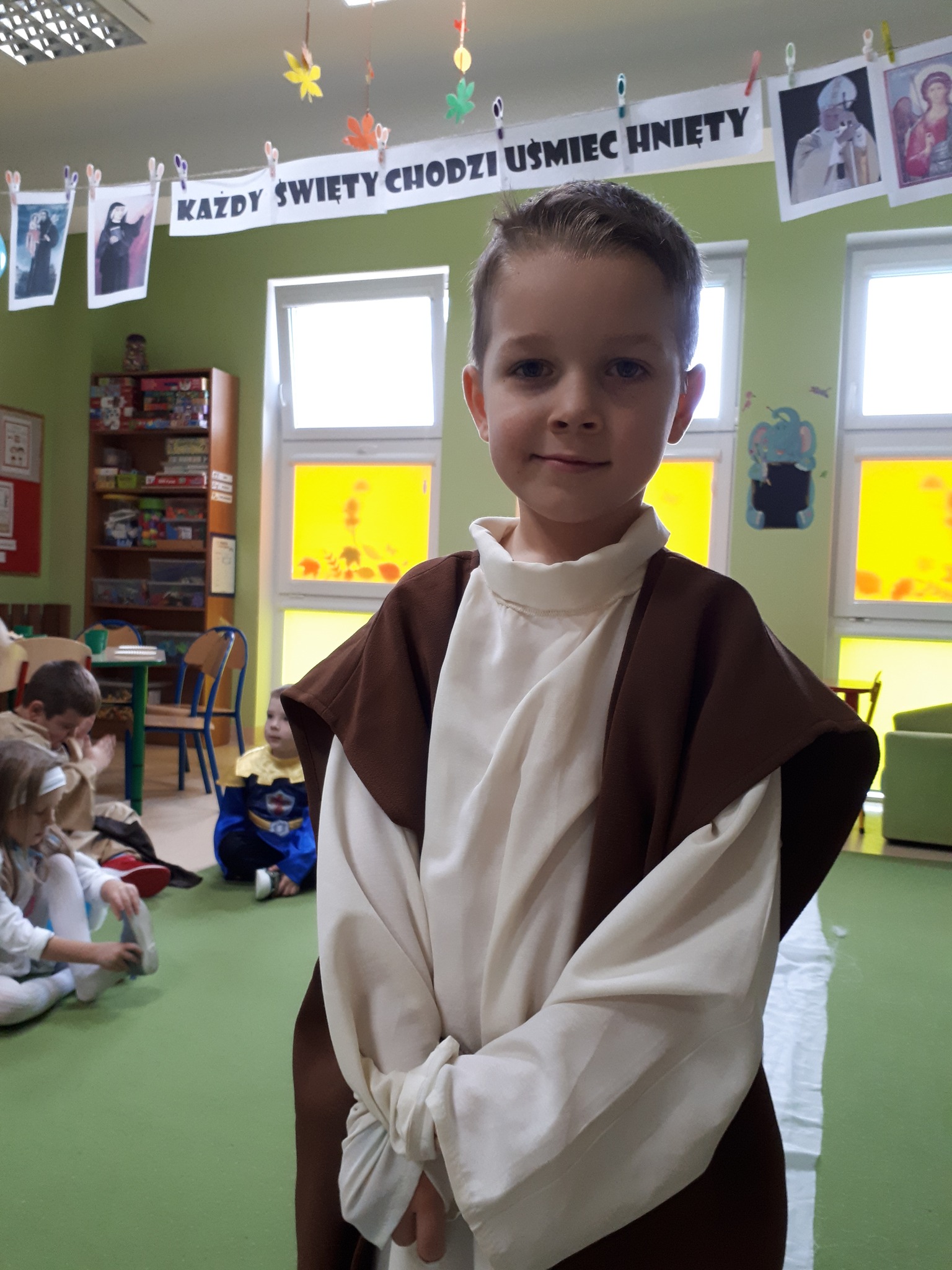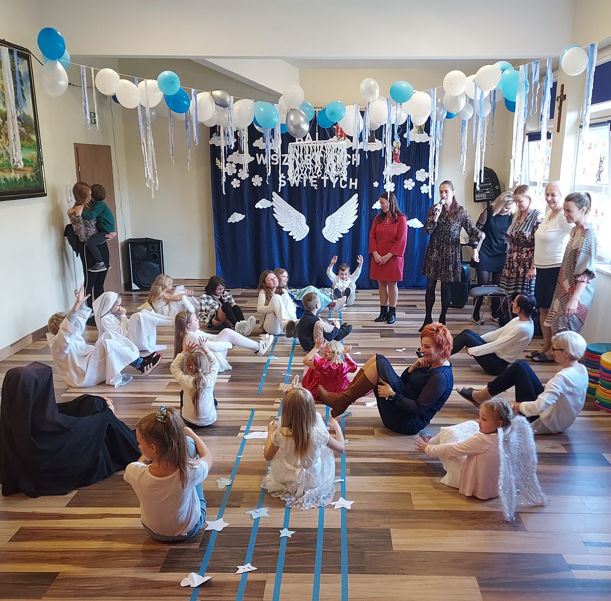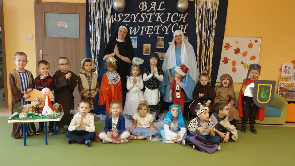 wraz z wychowawczyniami. Dzień ten stał się okazją do poznania kim byli nasi święci patronowie, czym się zajmowali i co sprawiło, że ich życie było tak wyjątkowe i święte. Dzieci dowiedziały się, że każdy z nas może zostać świętym, i że wcale nie potrzeba do tego żadnych wielkich, bohaterskich czynów. Ważne by w codziennym życiu i zwykłych sprawach kierować się miłością do siebie, innych i Pana Jezusa. Przedszkolaki rozwiązywały zagadki o tematyce religijnej oraz wielbiły Boga poprzez śpiew i taniec. Nie zabrakło również znanego i lubianego utworu „Święty uśmiechnięty”.