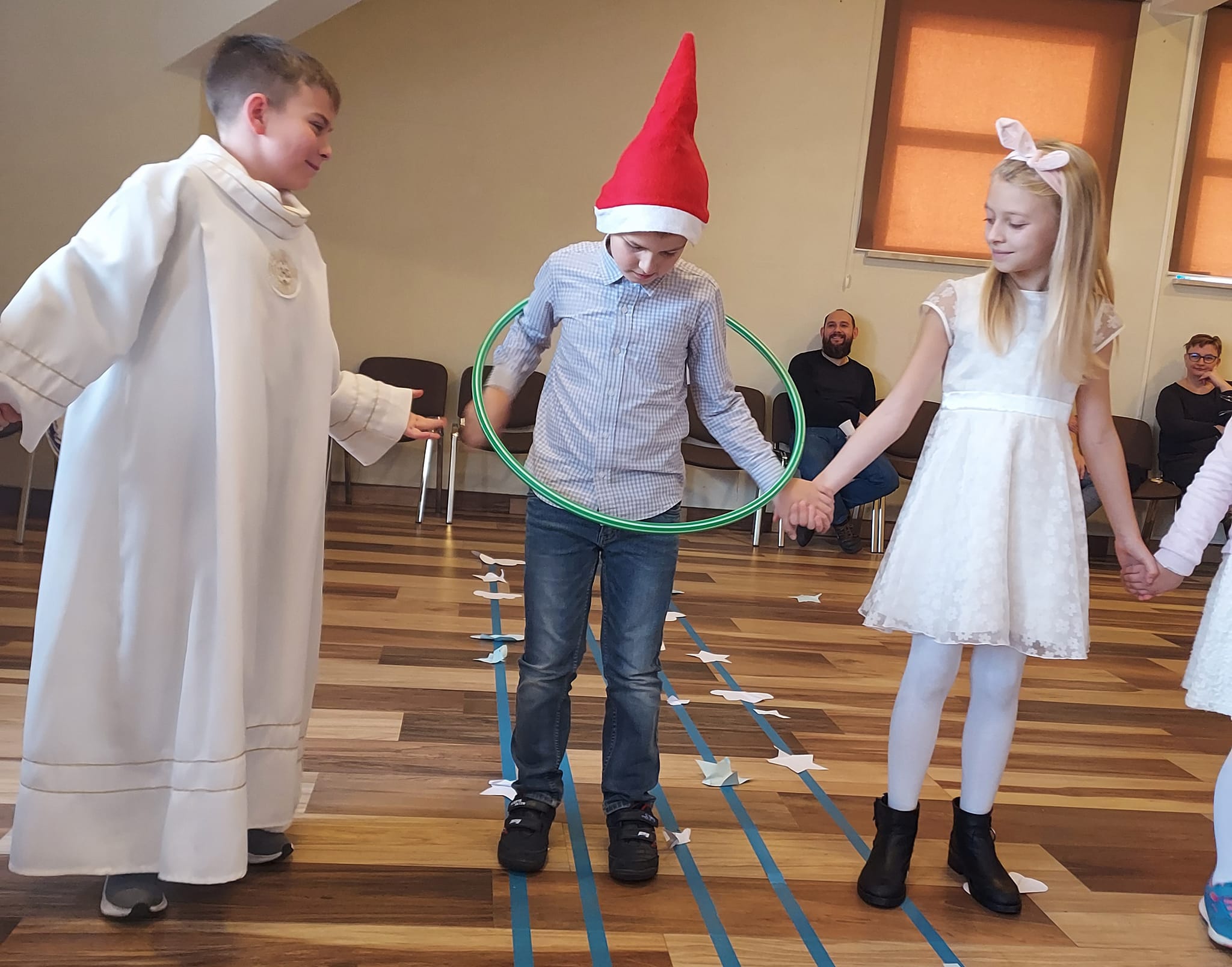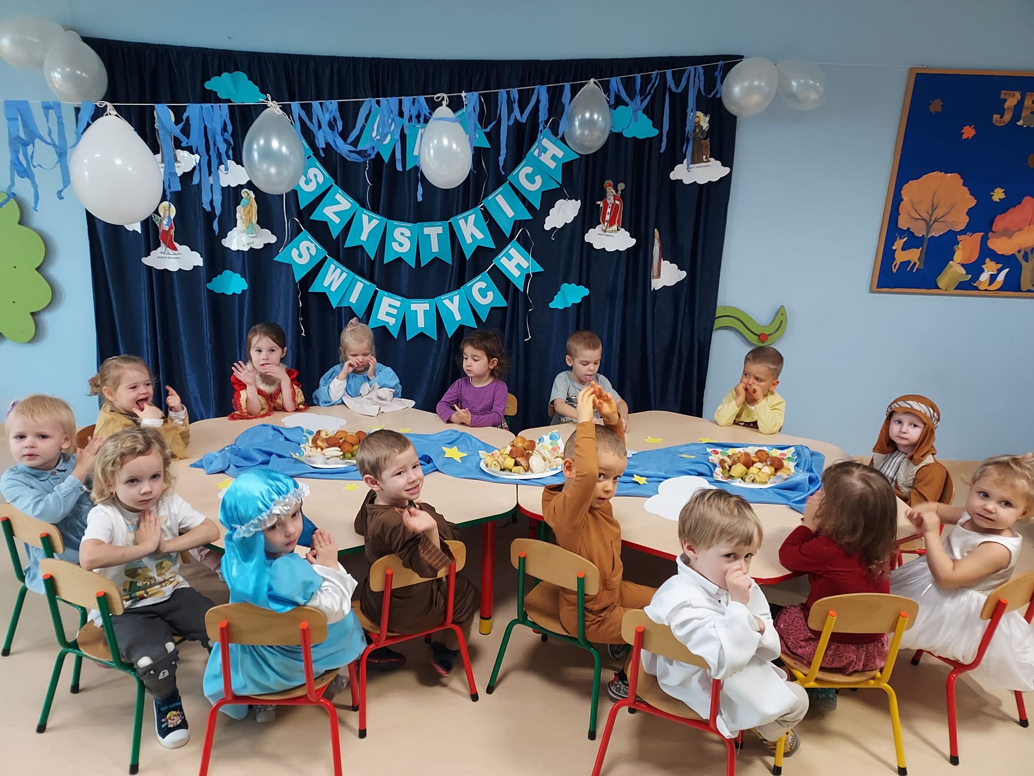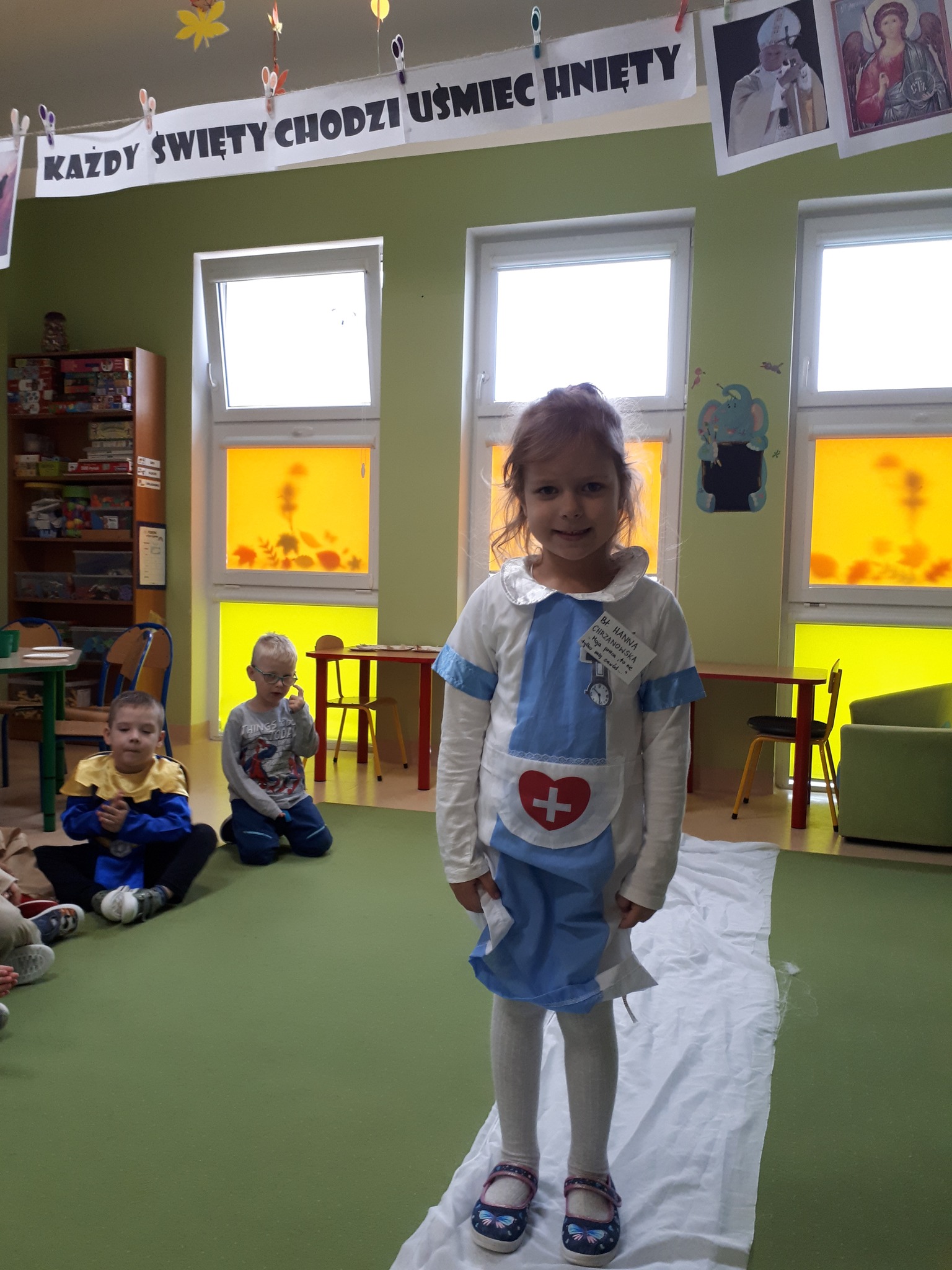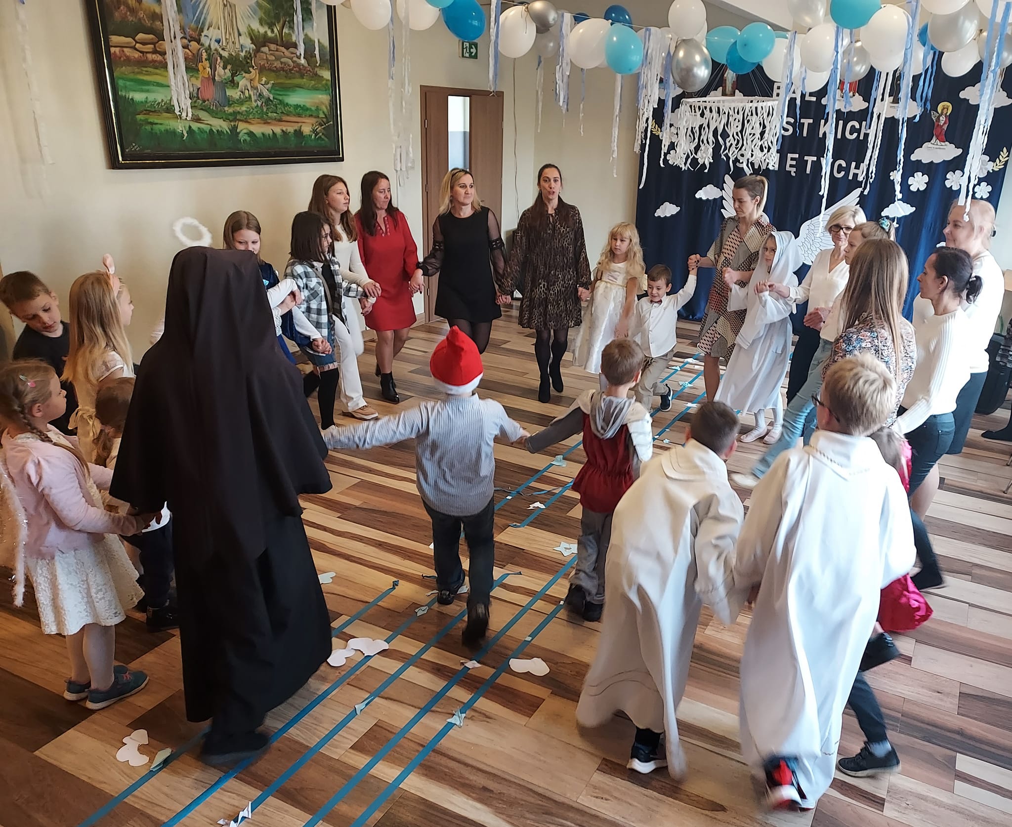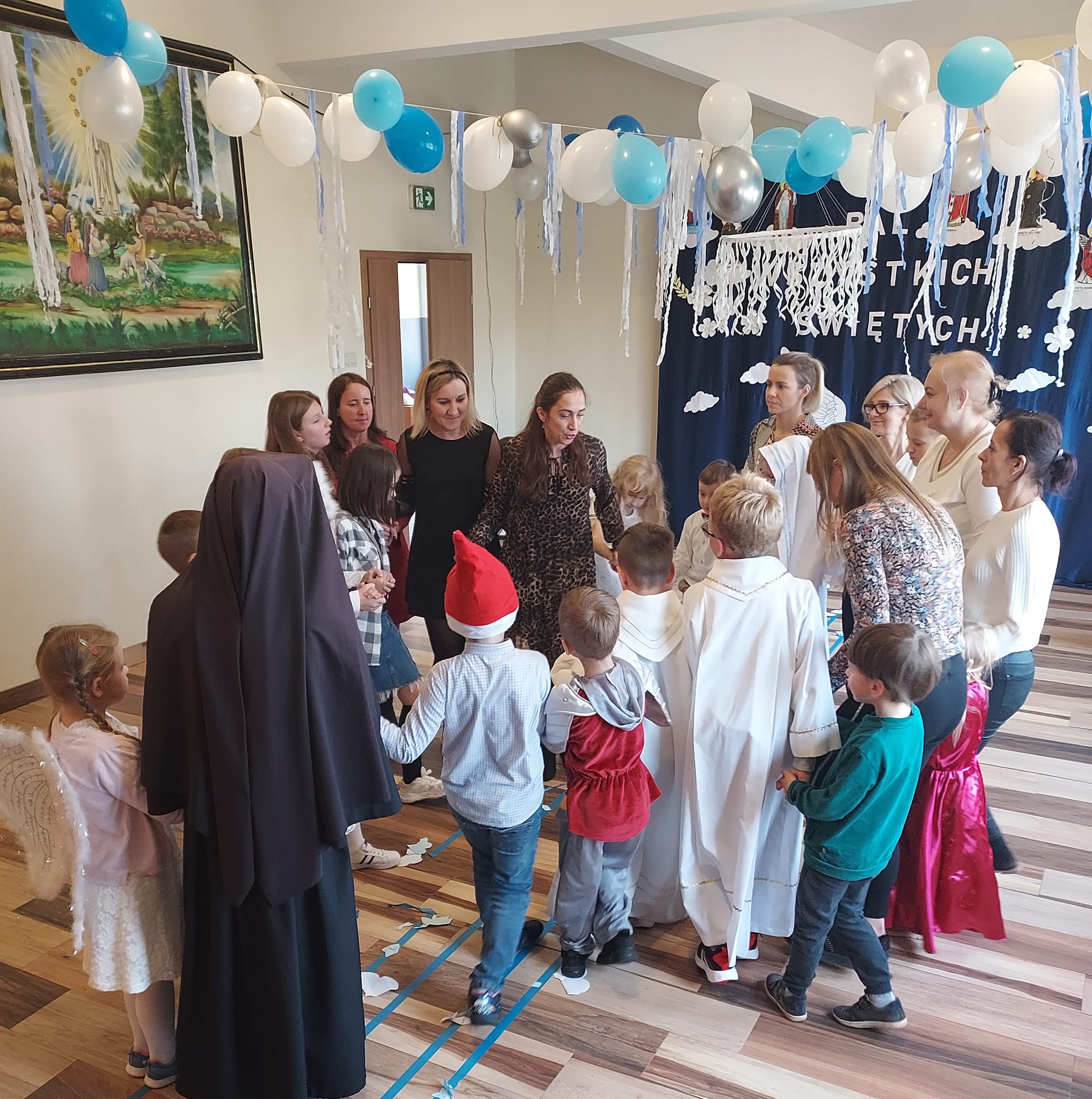 wraz z wychowawczyniami. Dzień ten stał się okazją do poznania kim byli nasi święci patronowie, czym się zajmowali i co sprawiło, że ich życie było tak wyjątkowe i święte. Dzieci dowiedziały się, że każdy z nas może zostać świętym, i że wcale nie potrzeba do tego żadnych wielkich, bohaterskich czynów. Ważne by w codziennym życiu i zwykłych sprawach kierować się miłością do siebie, innych i Pana Jezusa. Przedszkolaki rozwiązywały zagadki o tematyce religijnej oraz wielbiły Boga poprzez śpiew i taniec. Nie zabrakło również znanego i lubianego utworu „Święty uśmiechnięty”.