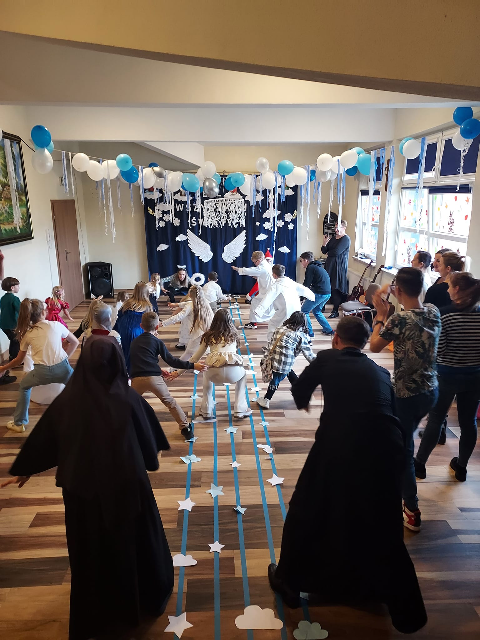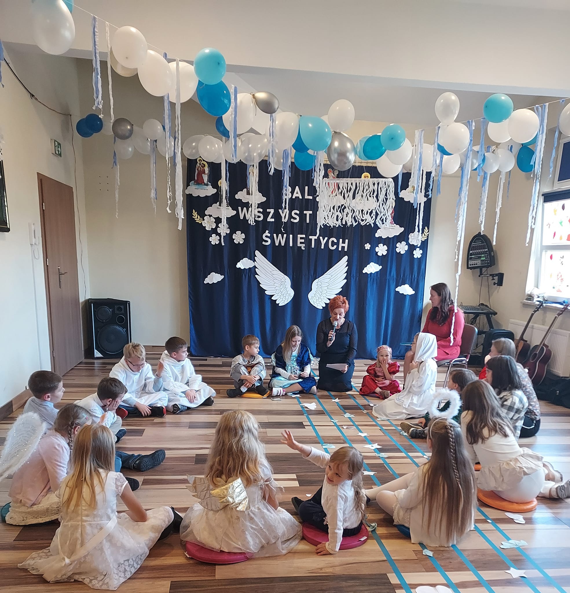 Dwa dni później, czyli w niedzielę 30 października 2022 roku odbył się Bal Wszystkich Świętych dla lokalnej społeczności parafialnej. Bal miał przypomnieć wszystkim, że święci są wśród nas obecni i nas wspomagają, a my wszyscy też jesteśmy powołani do świętości. Zabawę poprzedziła uroczysta msza święta. Tego dnia również nie zabrakło dzieci przebranych za świętych i błogosławionych. Podczas całej imprezy panowała iście „niebiańska” atmosfera. Jak w kalejdoskopie zmieniały się tańce i zabawy. Był też czas na słodki poczęstunek. Punktem kulminacyjnym był moment prezentacji poszczególnych strojów – trzeba przyznać, że wszyscy uczestnicy balu wykazali się ogromną pomysłowością i kreatywnością.