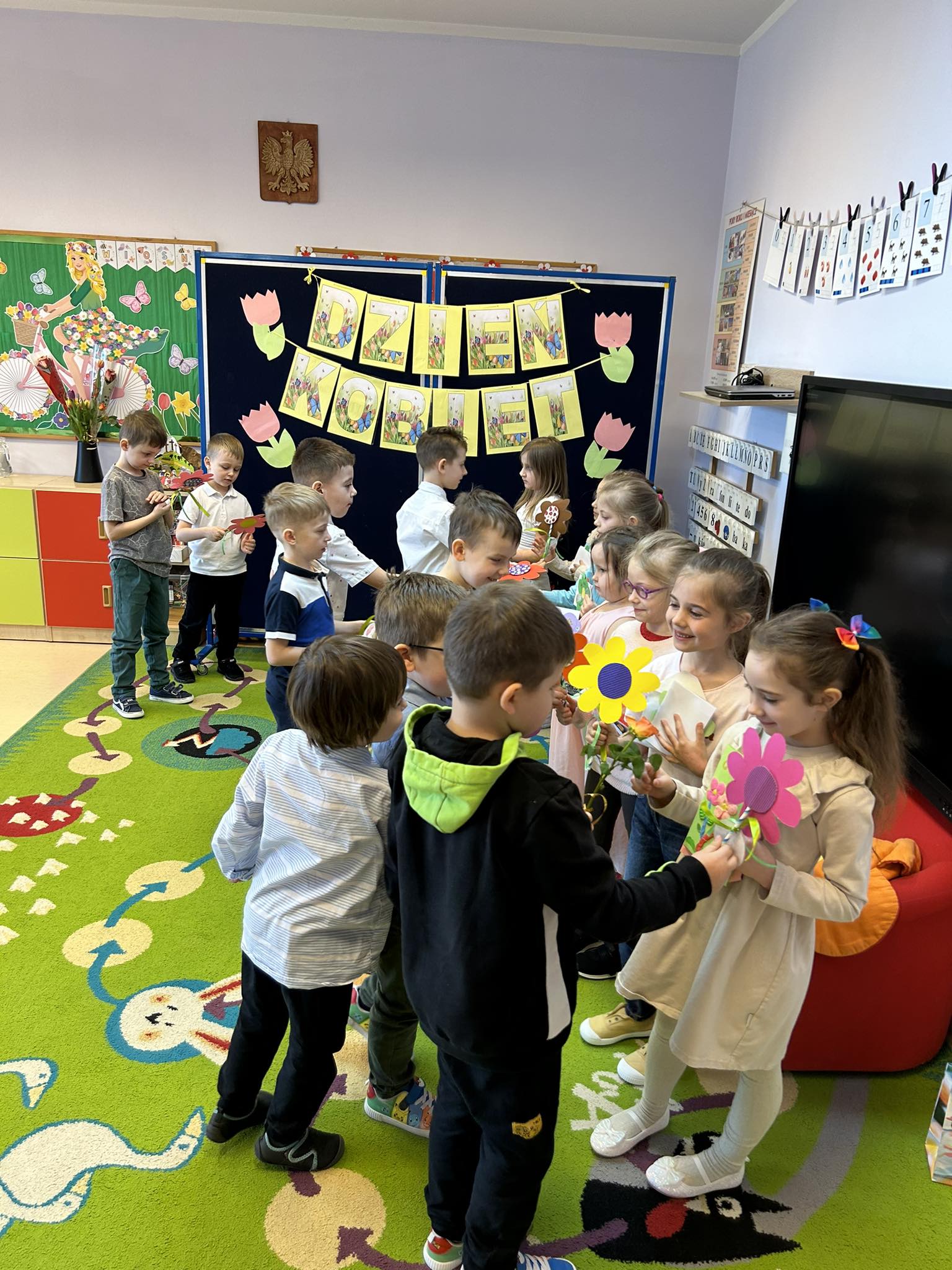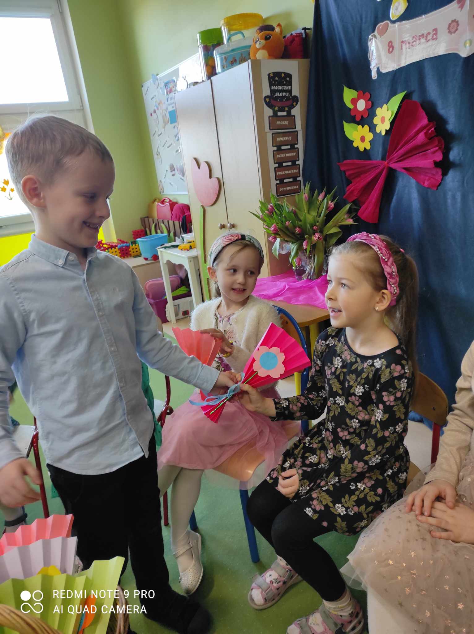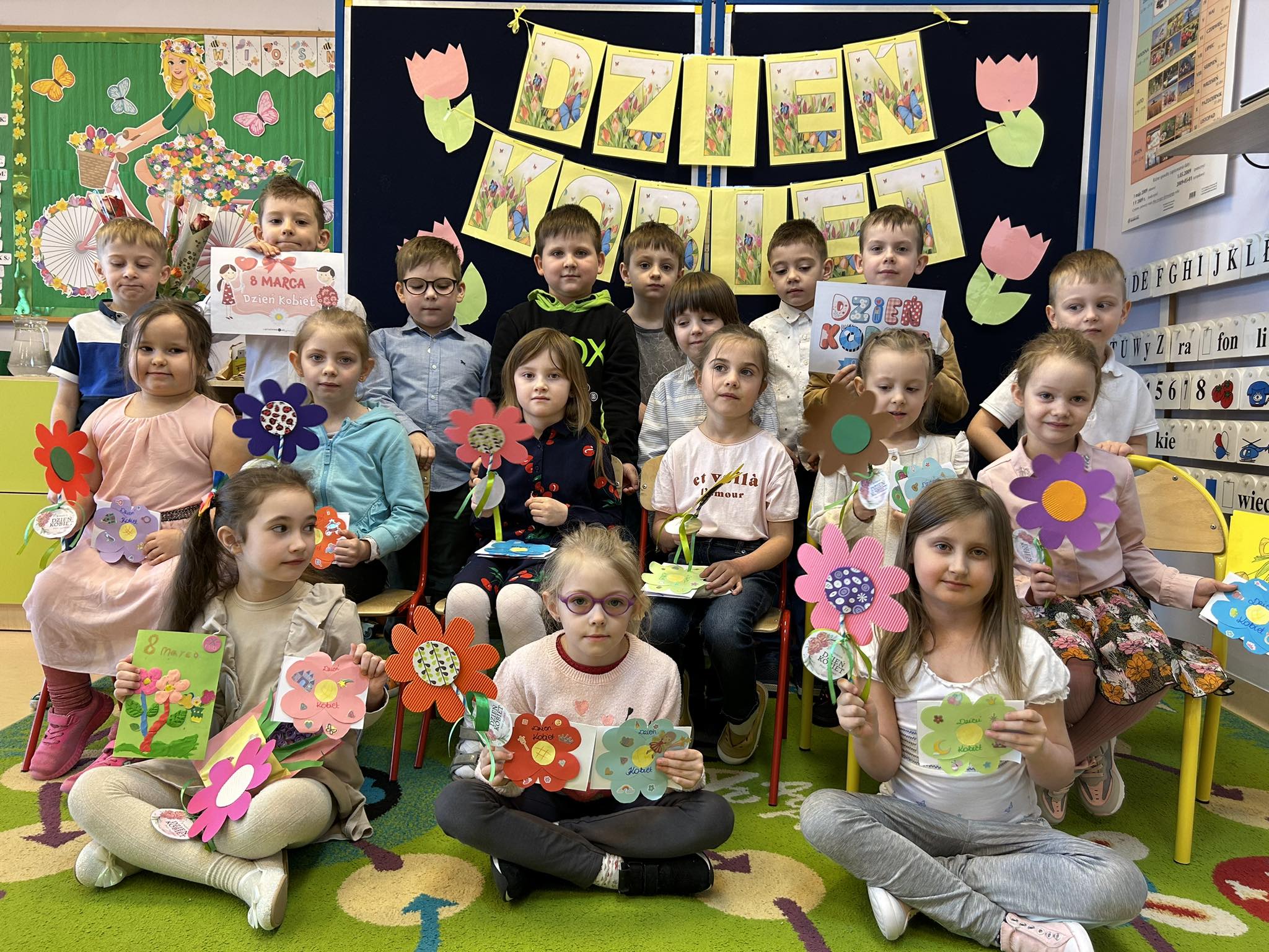 z dziećmi o roli kobiet w ich życiu – o mamusiach, babciach, siostrach, koleżankach, paniach z najbliższego otoczenia. Wychowawczynie wprowadzały uroczysty nastrój czytając przygotowane na tę okoliczność wiersze, śpiewając piosenki oraz wykonując piękne prace plastyczne. Dzień Kobiet w naszym przedszkolu upłynął w bardzo miłej atmosferze.