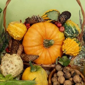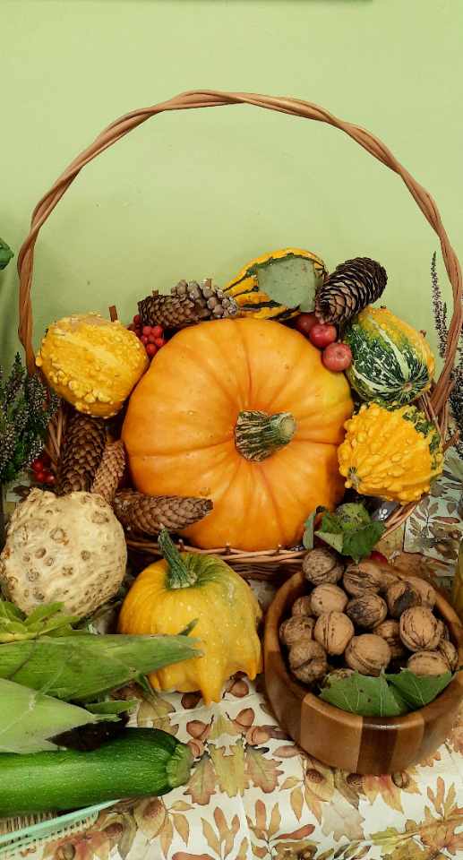 koszem pełnym jesiennych darów. W koszu nie zabrakło barwnych liści, dorodnych