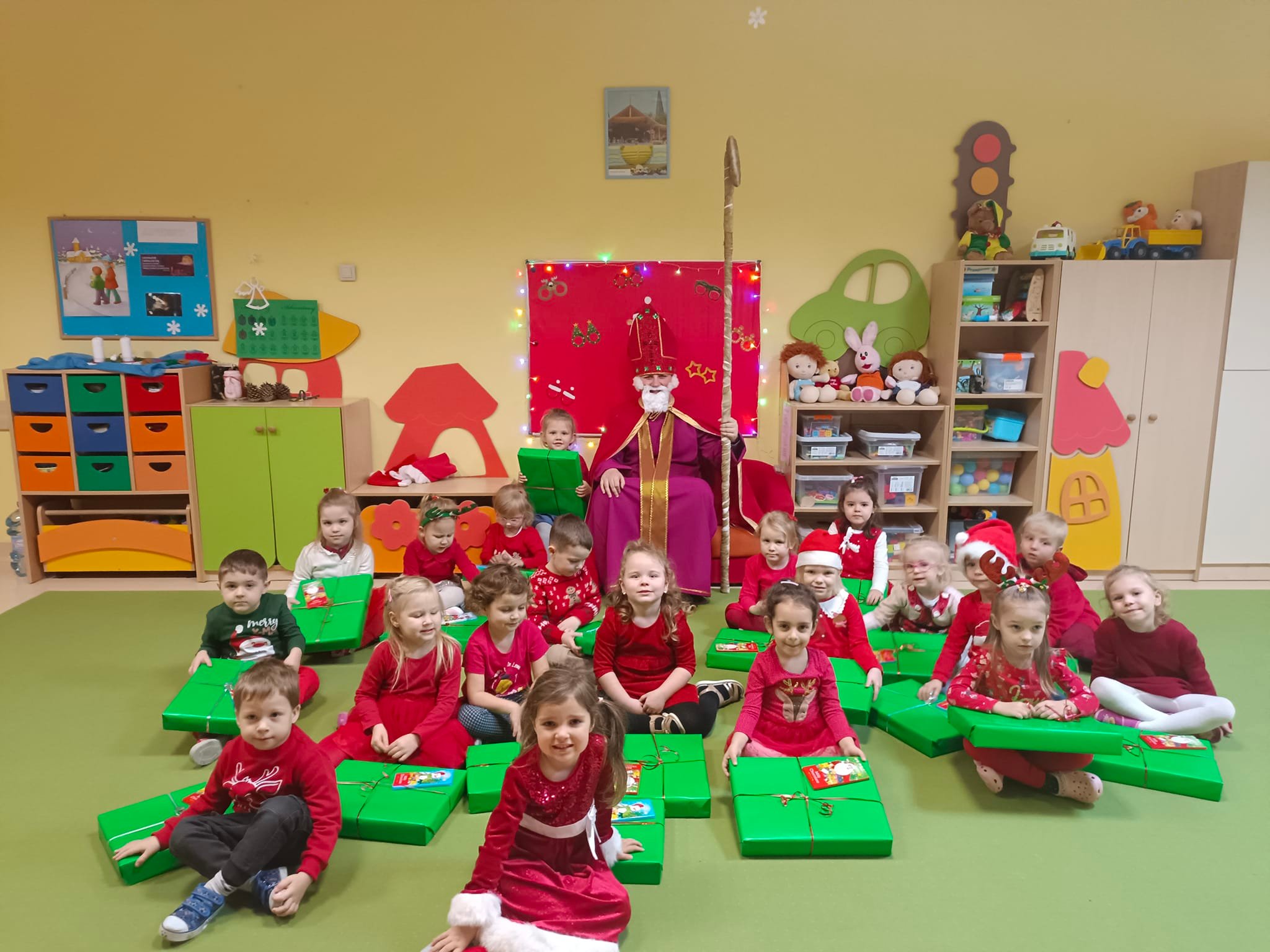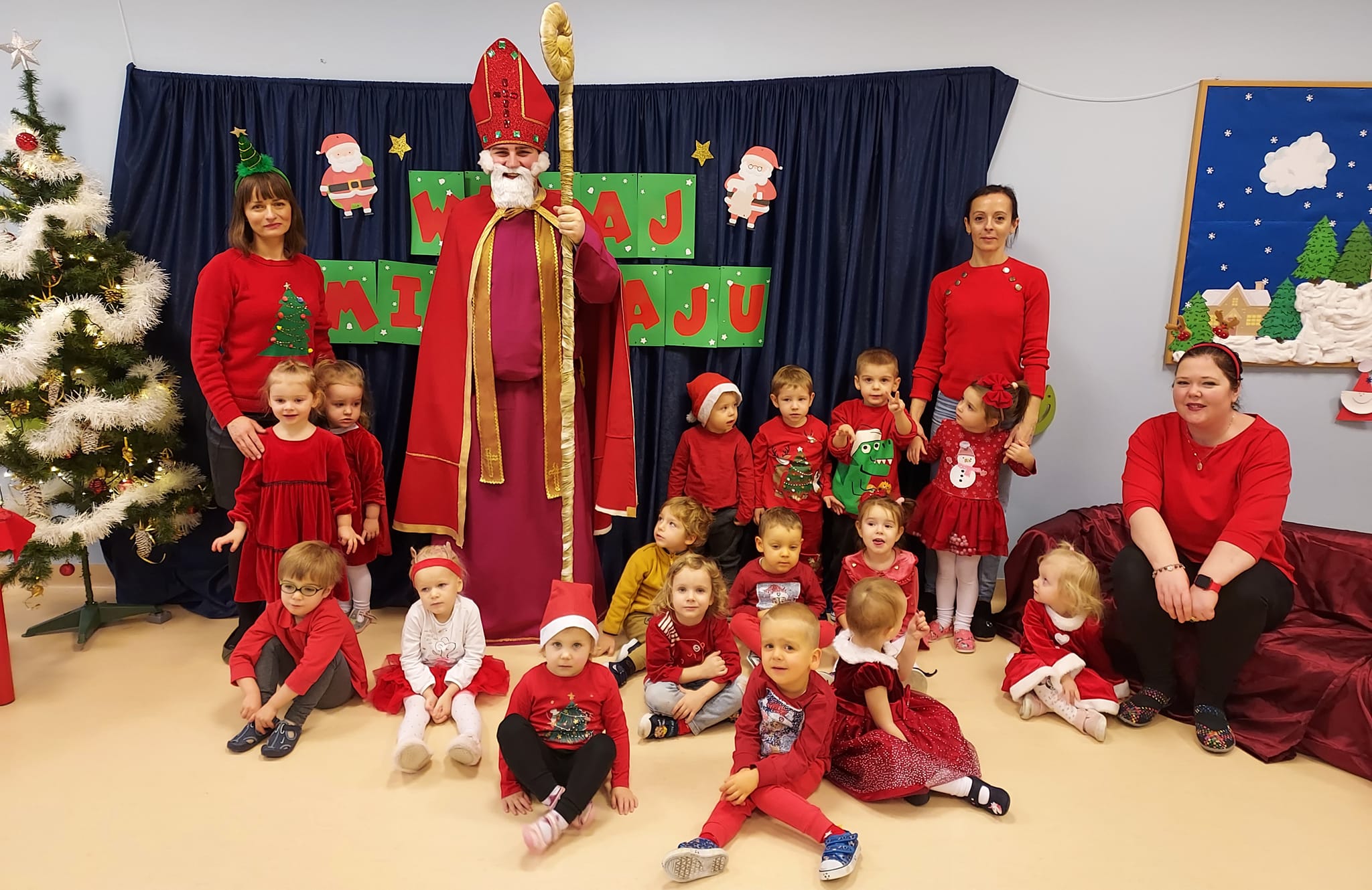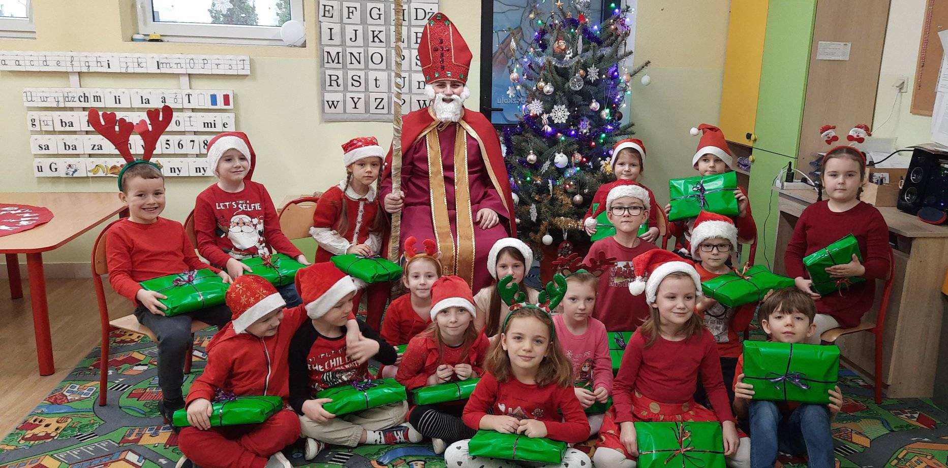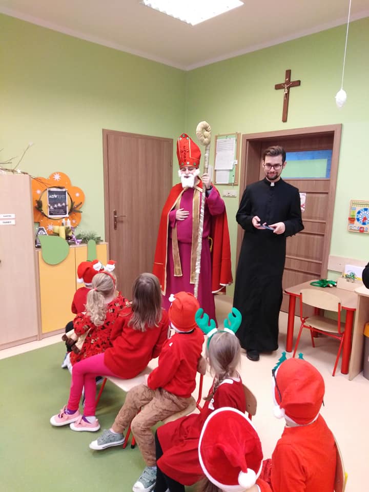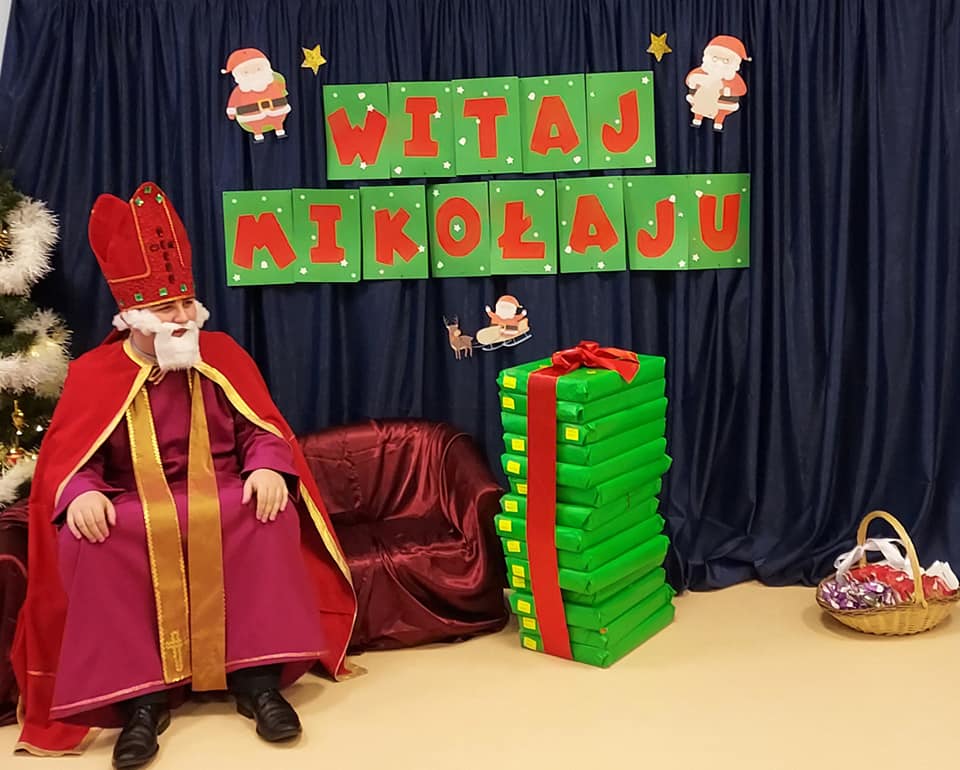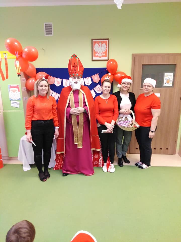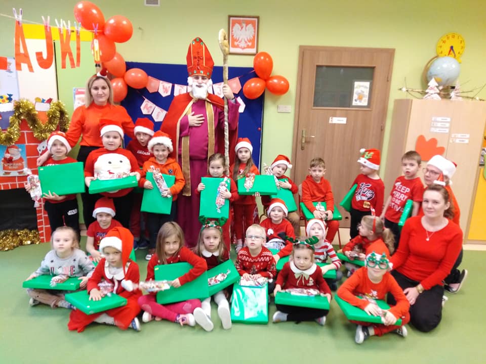 I nadszedł wreszcie ten dzień – 6 grudnia! Ubrane na czerwono dzieci już od samego rana z wielką niecierpliwością spoglądały na drzwi i nasłuchiwały „Mikołajowych” dzwoneczków. Święty Mikołaj nie kazał na siebie długo czekać i zaraz po śniadaniu zawitał do naszego przedszkola. Ukochany i długo wyczekiwany gość miał na sobie piękny biskupi strój, w dłoni trzymał pastorał, a na twarzy widać było serdeczny uśmiech. Dzieci zapraszały niezwykłego gościa okrzykiem „Kochamy Cię św. Mikołaju!” Kiedy św. Mikołaj pojawiał się w kolejnych salach, przedszkolaki odważnie recytowały przygotowane wcześniej utwory, śpiewały piosenki, a także chętnie rozmawiały z niecodziennym gościem. Był też czas na radosne pląsy przy muzyce oraz pamiątkowe zdjęcia. Na koniec wizyty w przedszkolu, św. Mikołaj wręczył każdemu dziecku wspaniały prezent.