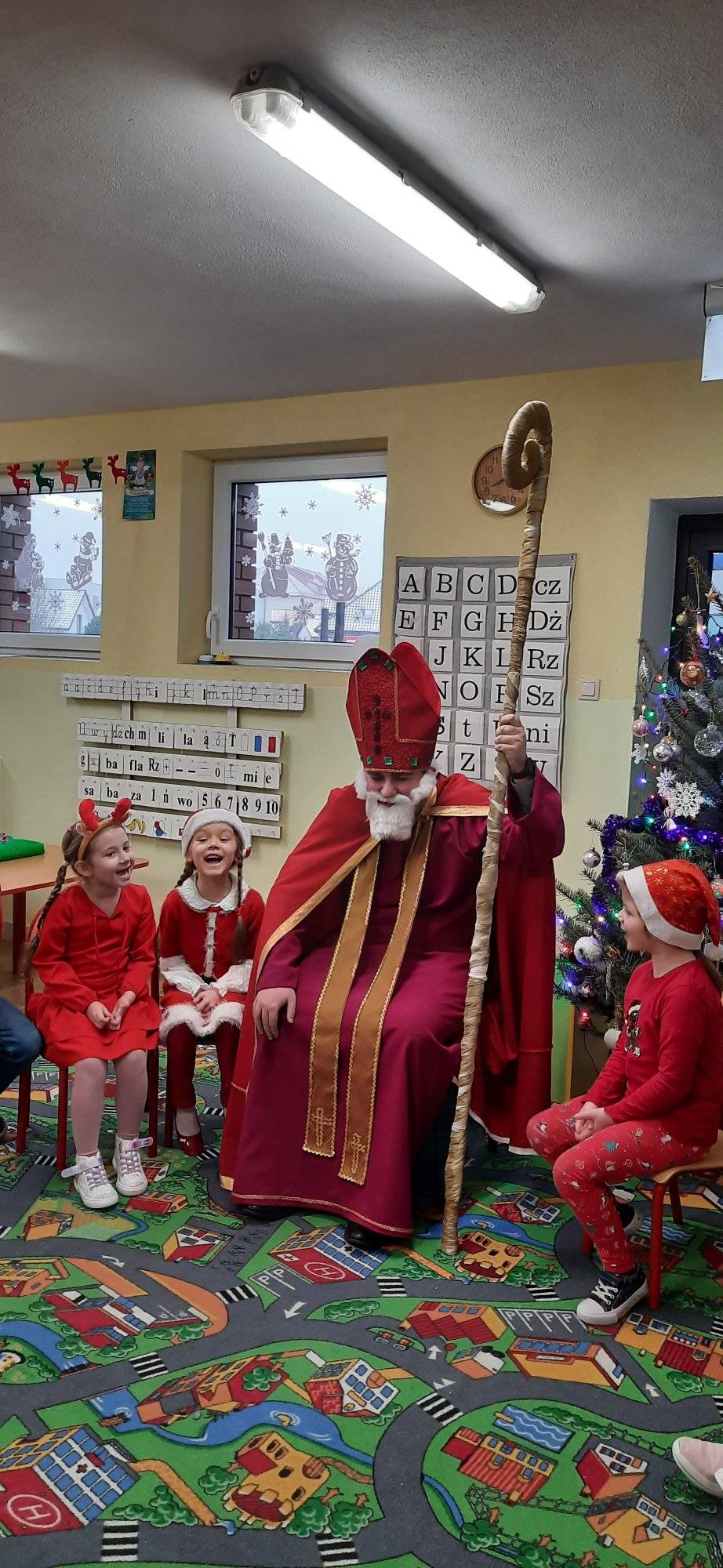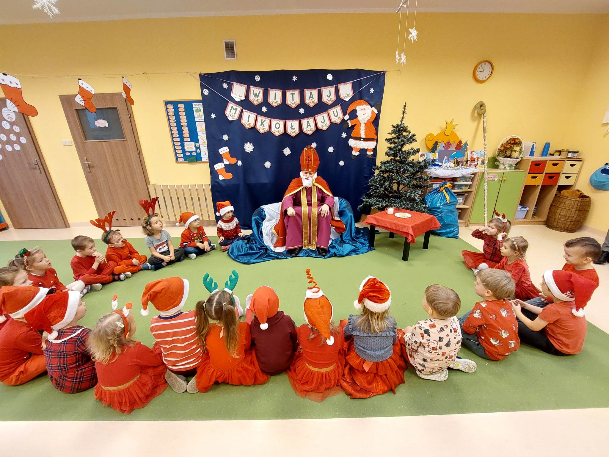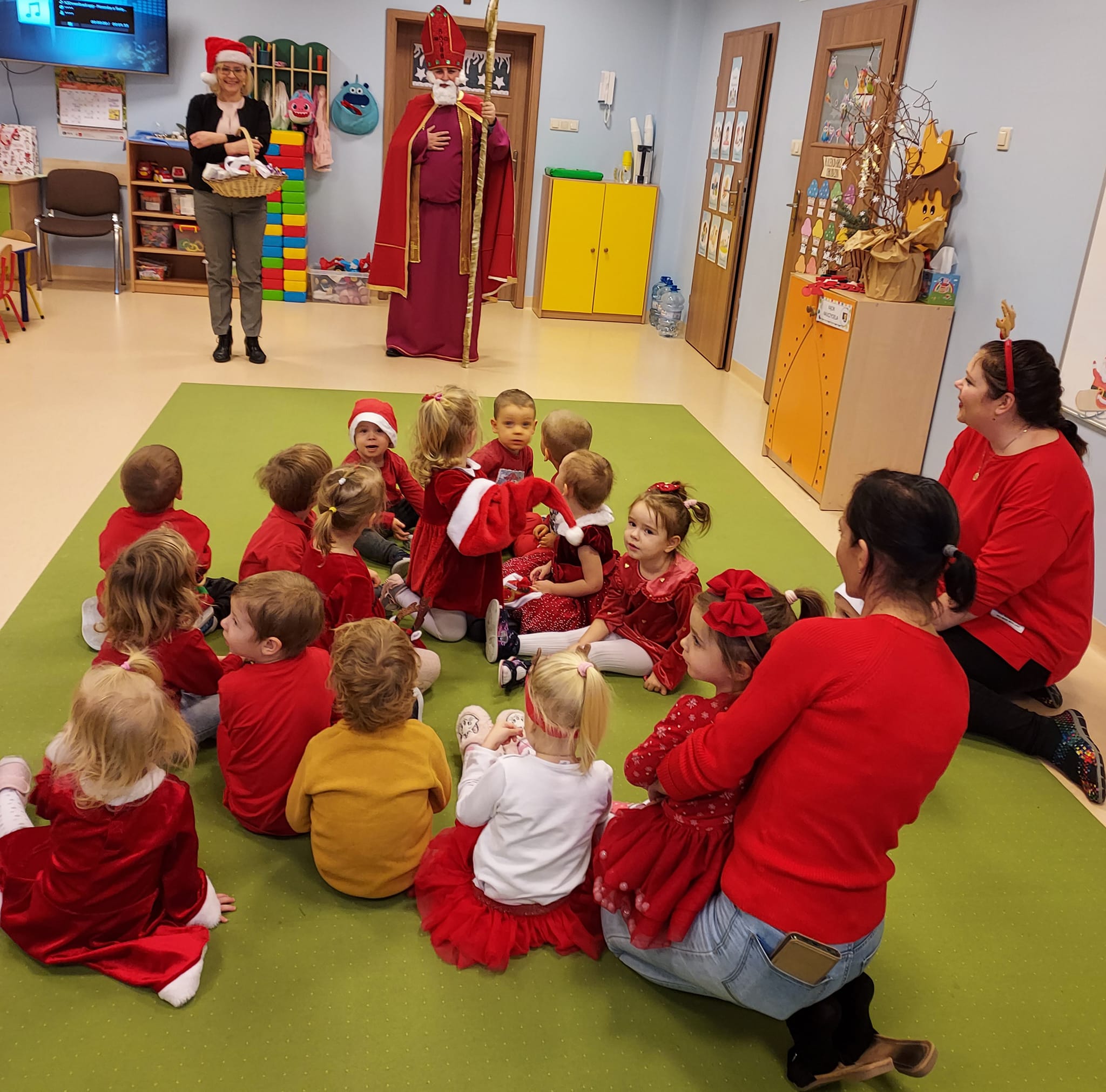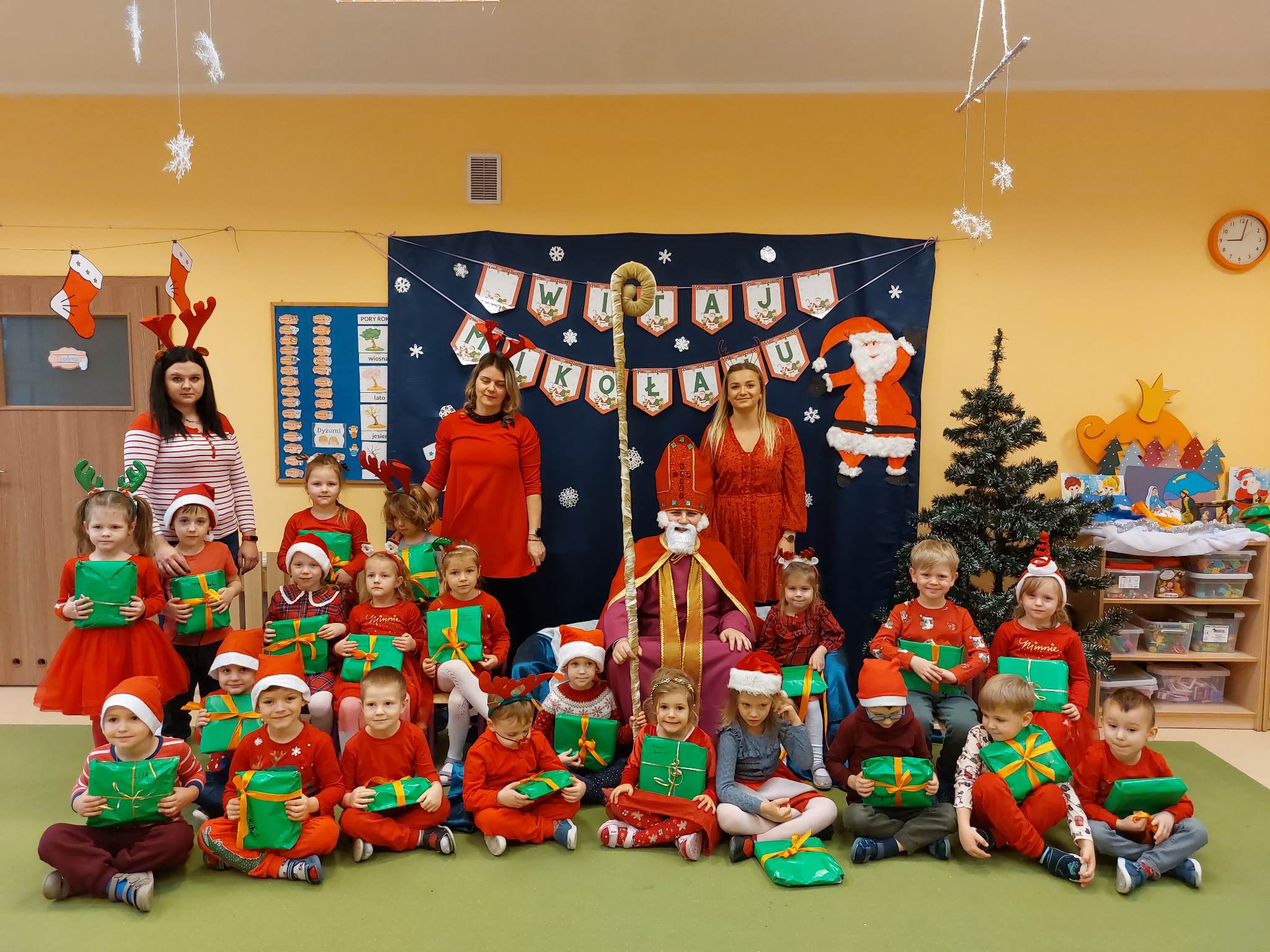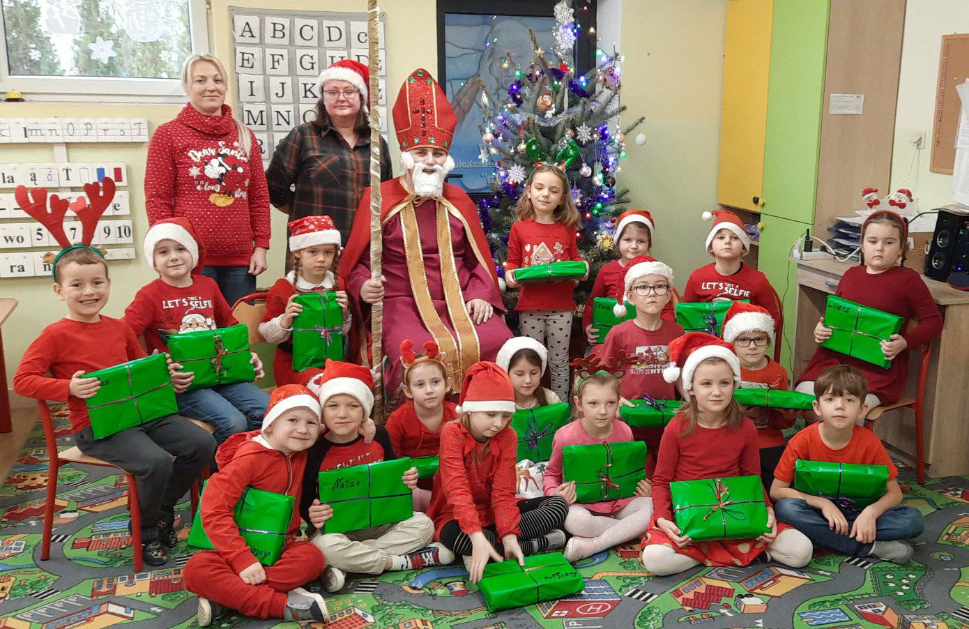 I nadszedł wreszcie ten dzień – 6 grudnia! Ubrane na czerwono dzieci już od samego rana z wielką niecierpliwością spoglądały na drzwi i nasłuchiwały „Mikołajowych” dzwoneczków. Święty Mikołaj nie kazał na siebie długo czekać i zaraz po śniadaniu zawitał do naszego przedszkola. Ukochany i długo wyczekiwany gość miał na sobie piękny biskupi strój, w dłoni trzymał pastorał, a na twarzy widać było serdeczny uśmiech. Dzieci zapraszały niezwykłego gościa okrzykiem „Kochamy Cię św. Mikołaju!” Kiedy św. Mikołaj pojawiał się w kolejnych salach, przedszkolaki odważnie recytowały przygotowane wcześniej utwory, śpiewały piosenki, a także chętnie rozmawiały z niecodziennym gościem. Był też czas na radosne pląsy przy muzyce oraz pamiątkowe zdjęcia. Na koniec wizyty w przedszkolu, św. Mikołaj wręczył każdemu dziecku wspaniały prezent.
