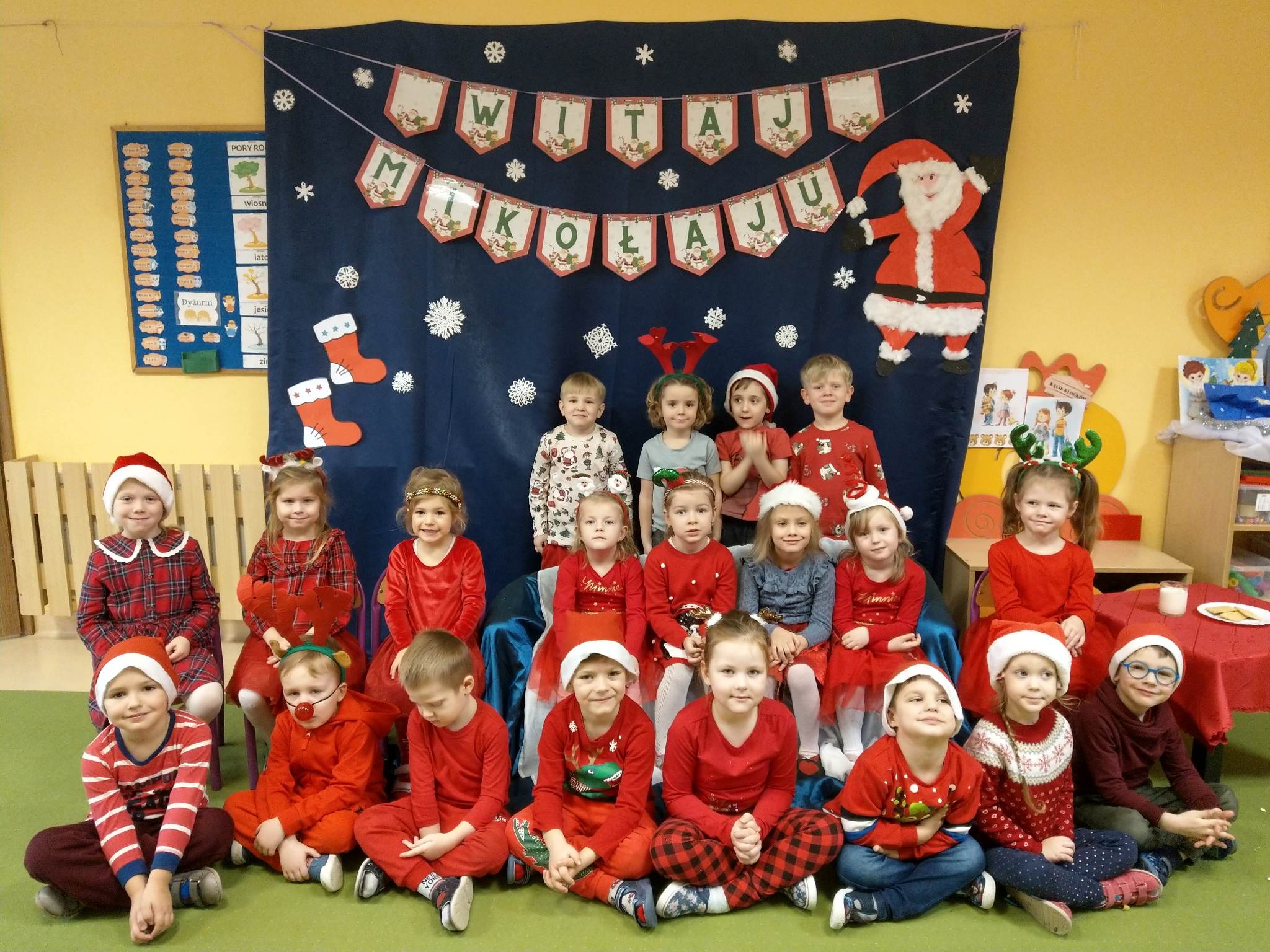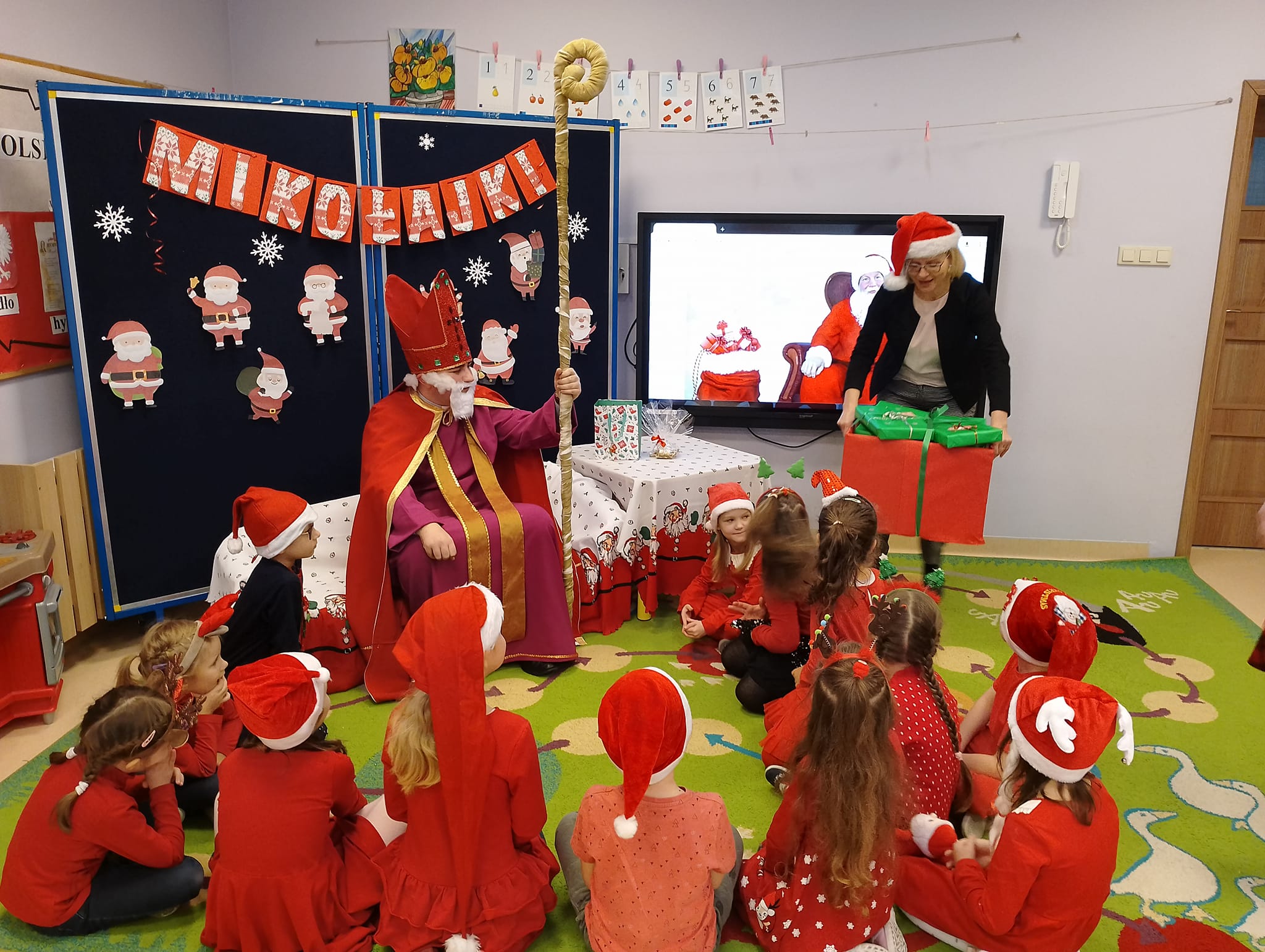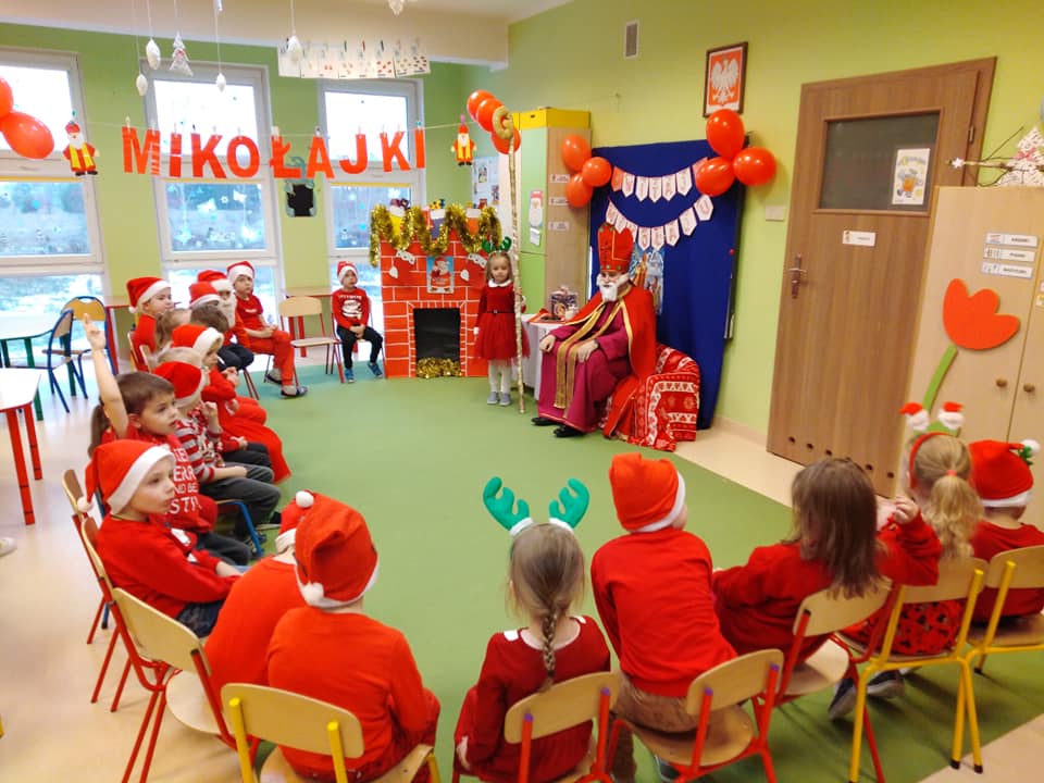 Wizyta św. Mikołaja w przedszkolu to jeden z najbardziej oczekiwanych przez dzieci dni w roku. Każda grupa od dłuższego czasu starannie przygotowywała się na to wydarzenie. Na tablicach w szatni pojawiły się bardzo ciekawe prace plastyczne przedstawiające postać św. Mikołaja z Miry i jego działalność. Na spotkanie z Mikołajem, oprócz prac plastycznych, przedszkolaki przygotowały również świąteczne wiersze i piosenki.